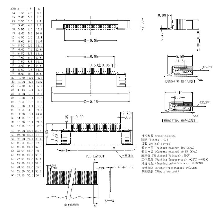 0.5 pitch 抽鎖式SMT下接式FPC