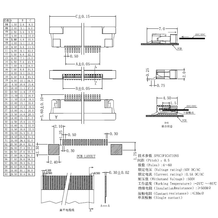 0.5 pitch 抽鎖式SMT下接式半包FPC
