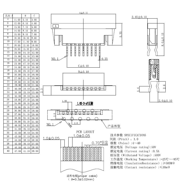 1.0pitch 帶鎖立插抽拔式單面接觸H=2.45