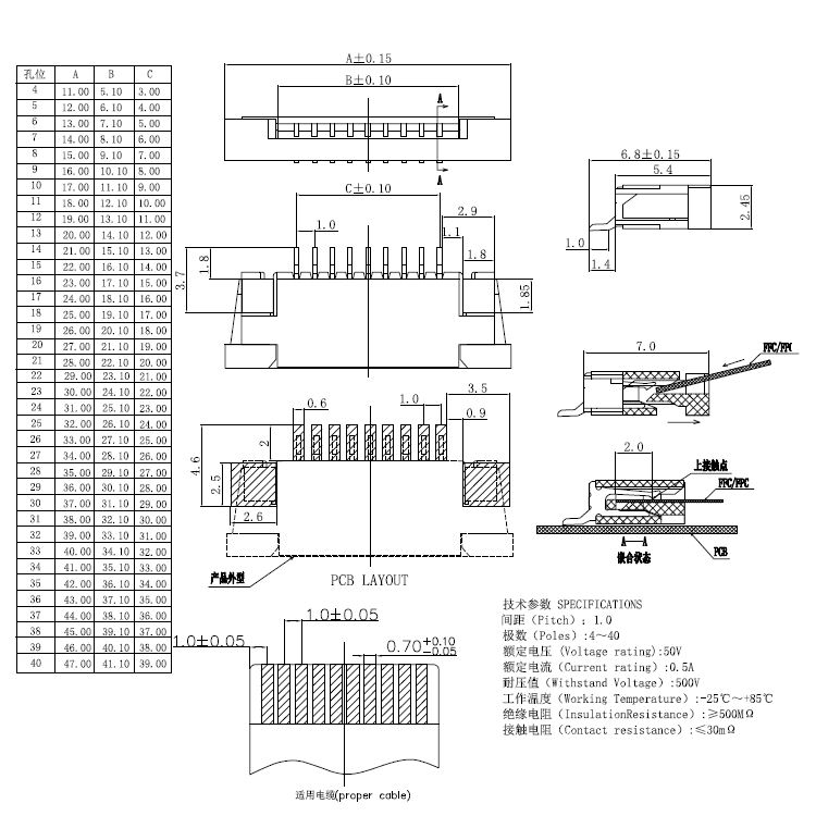 1.0pitch 帶鎖臥貼抽拔式上接H=2.45