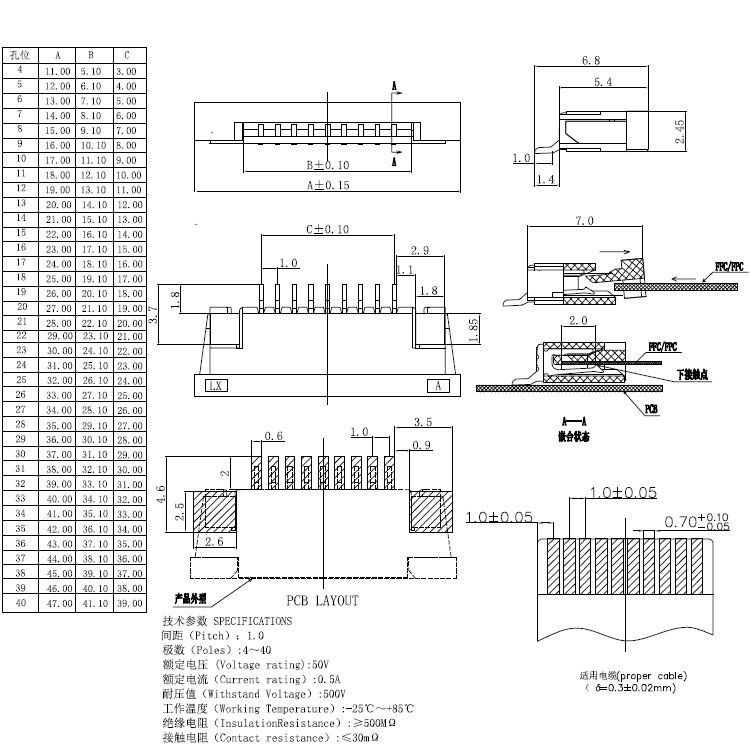 1.0pitch 帶鎖臥貼抽拔式下接H=2.45