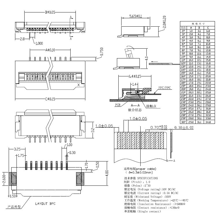 1.0pitch 帶鎖臥貼上翻下接H=2.0