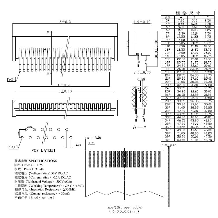 1.25pitch 雙排正腳立插單面接觸H=4.9