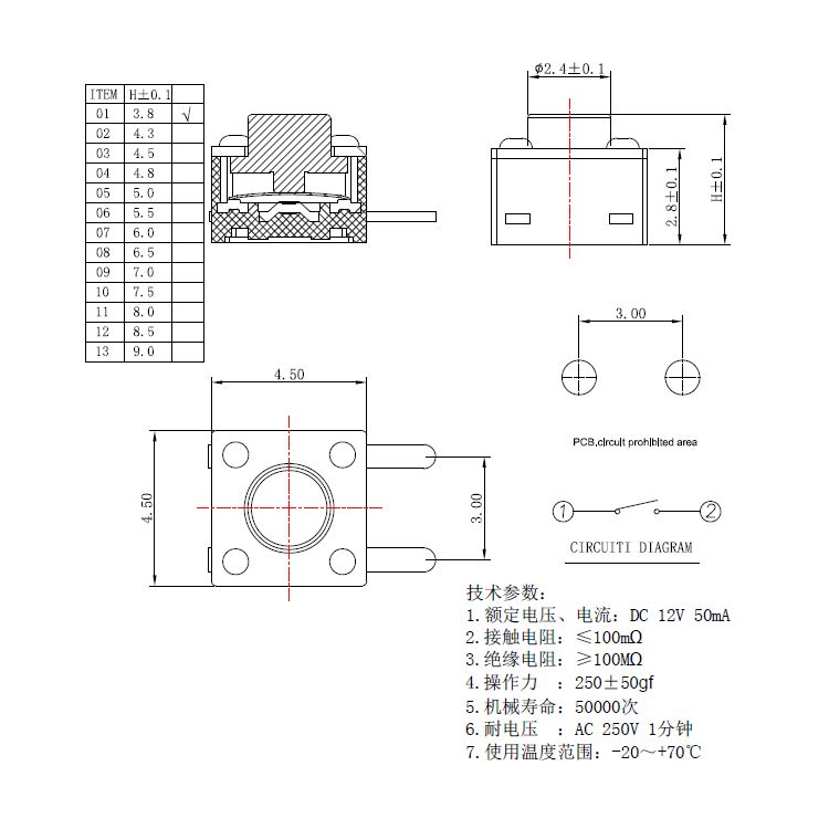 規格:4.5mm*4.5mm*3.8 ? ? ? ? ? ? ? ? ?力度:250士50gf