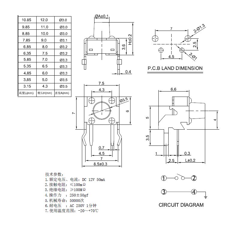輕觸開關技術參數: