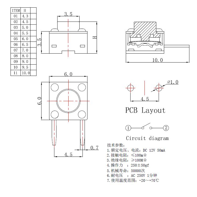 規格:6mm*6mm ? ? ? ? ? ? ? ? ?力度:250士50gf