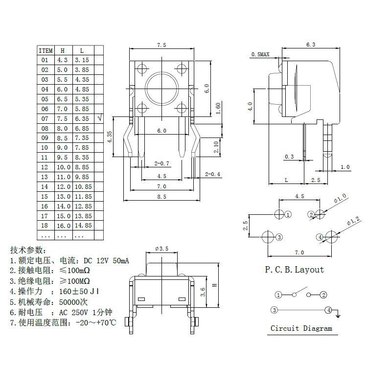 規(guī)格:6mm*6mm*7.5 ? ? ? ? ? ? ? ? ?力度:160士50gf
