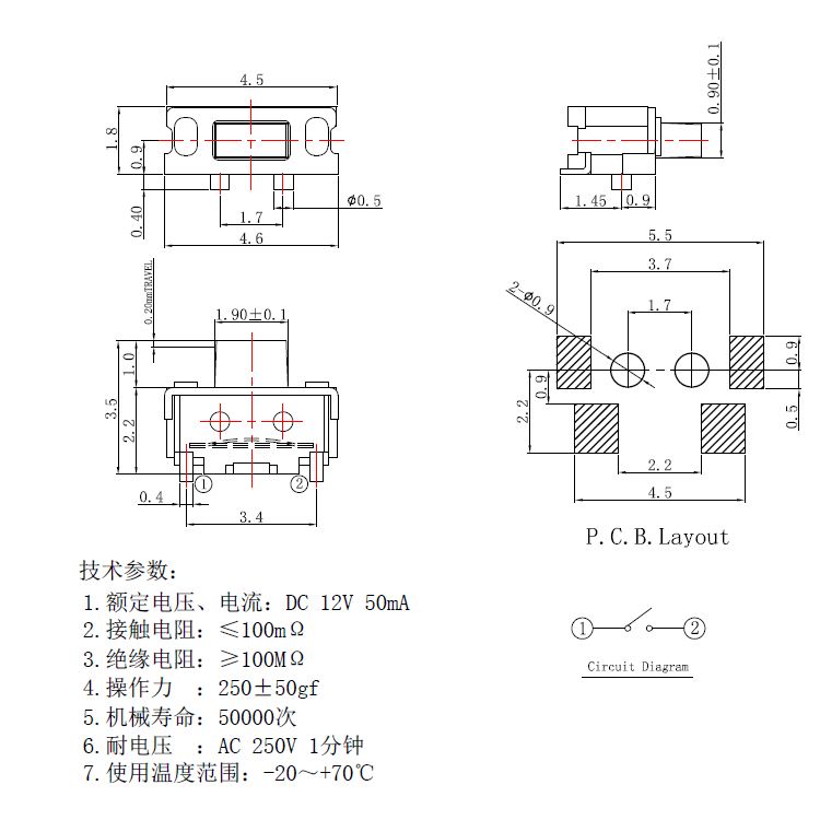 1. 額定電流、電壓: DC 12V 50mA 2. 接觸電阻: ≤100mΩMAX