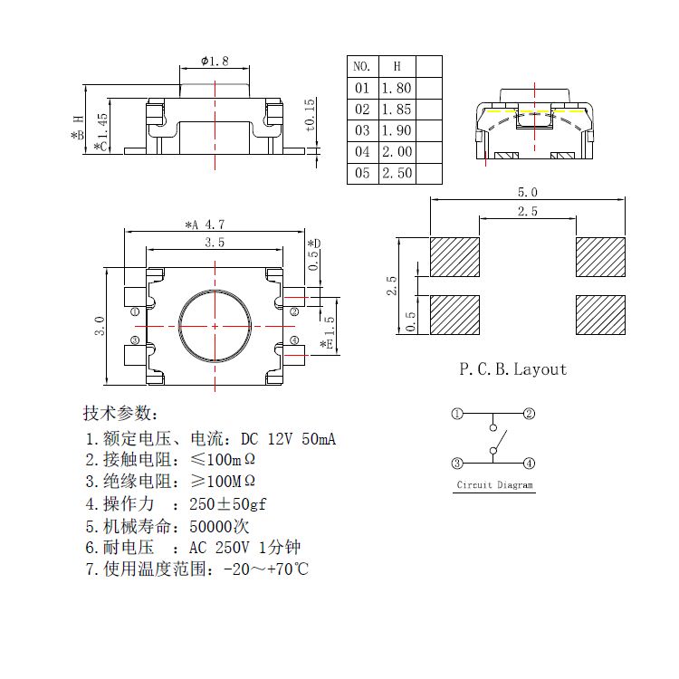 7. 使用濕度: ≤85% RH 8. 使用壽命: 50000次