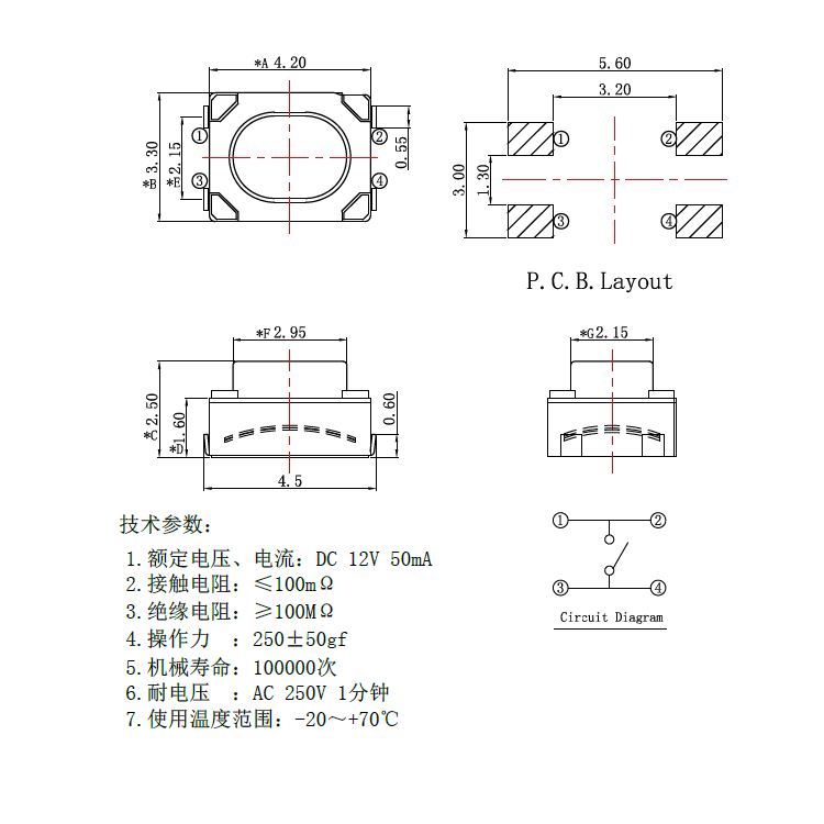 規格:3.2mm*4.2mm ? ? ? ? ? ? ? ? ?力度:250士50gf