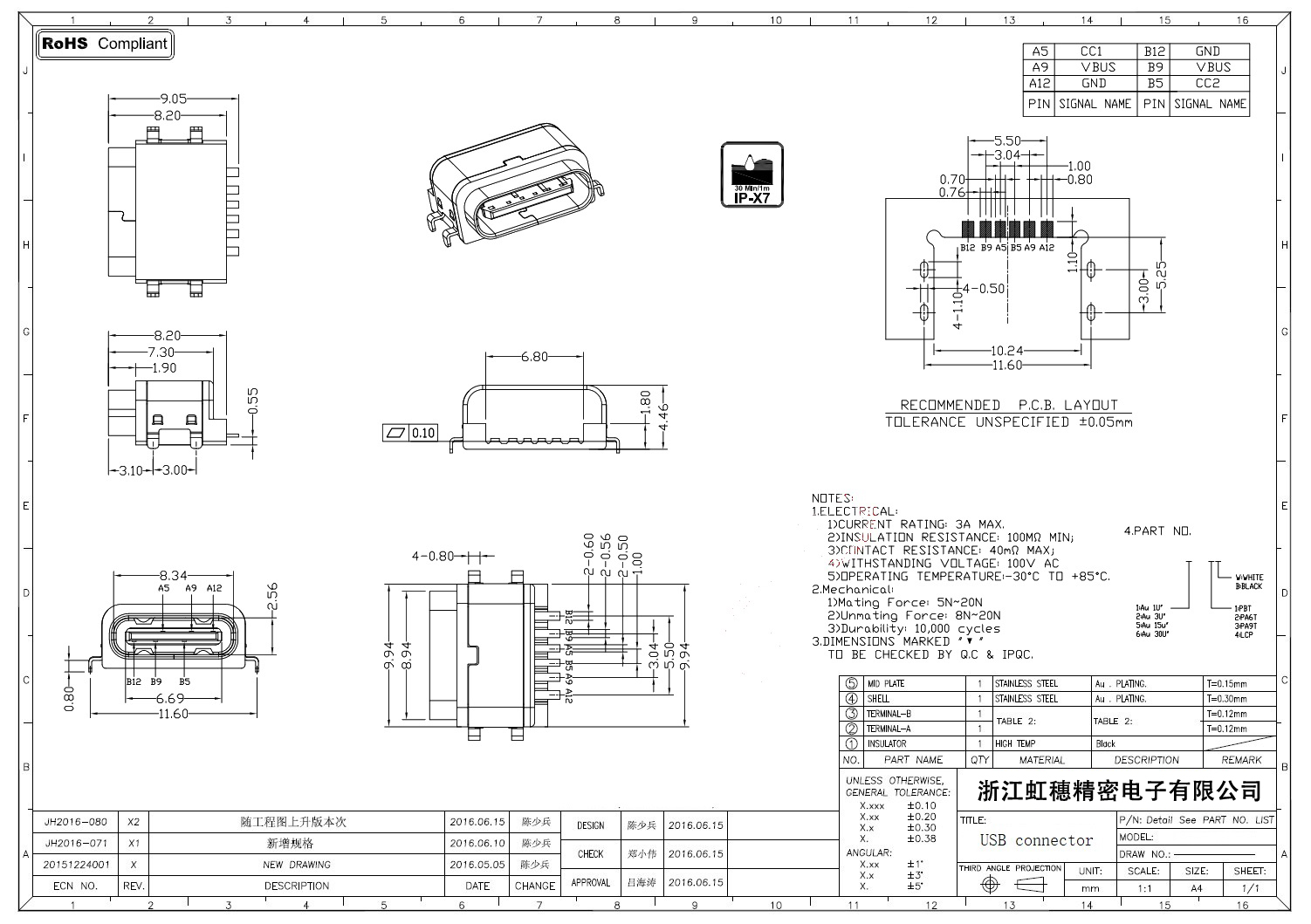 USB TypeC防水母座技術參數: