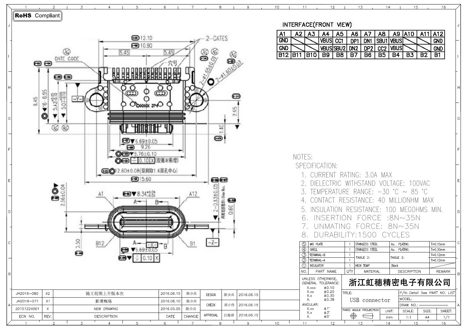 USB TypeC防水母座技術參數: