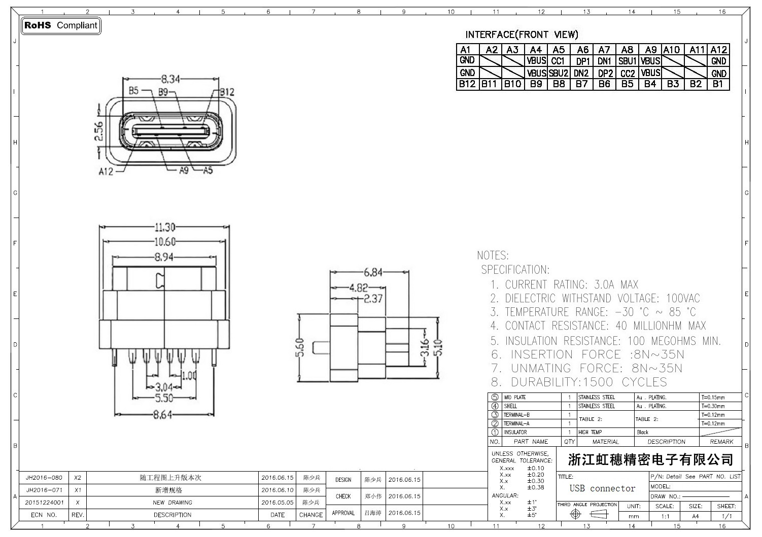 USB TypeC防水母座技術參數: