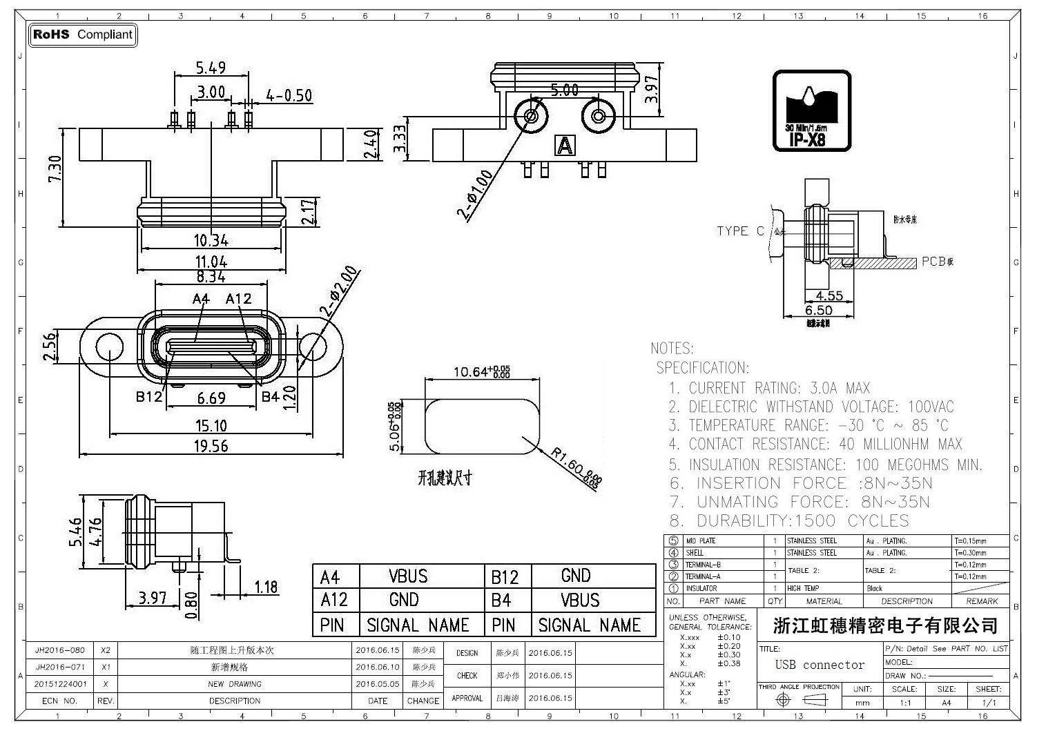 USB TypeC防水母座技術參數:
