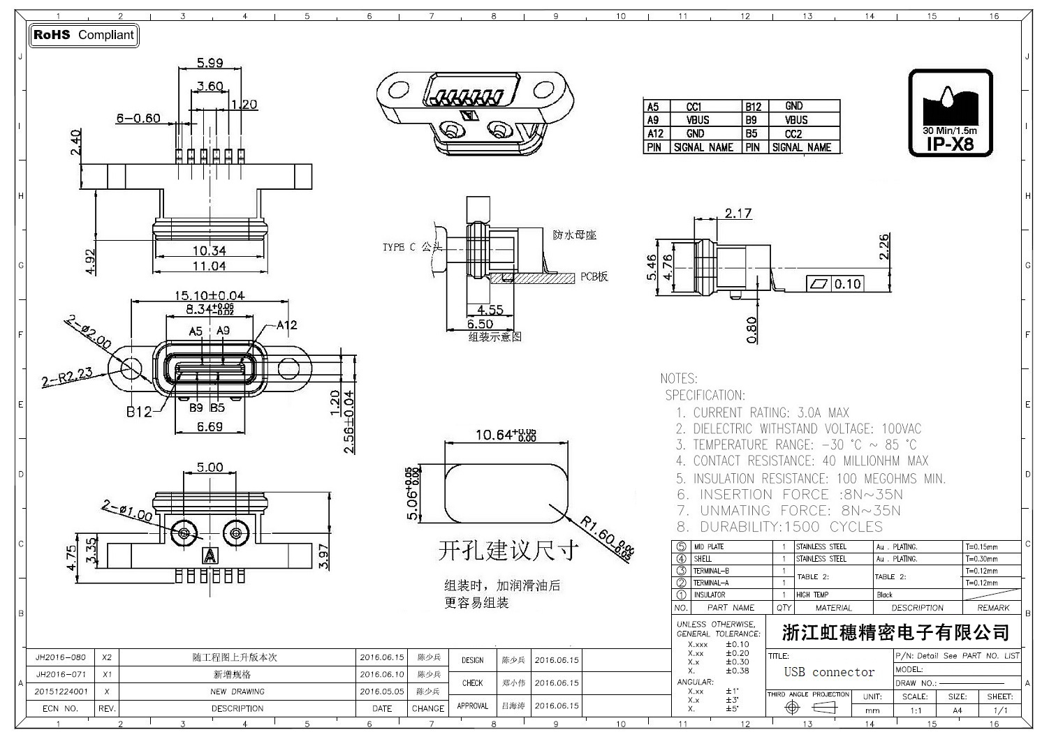 USB TypeC防水母座技術參數: