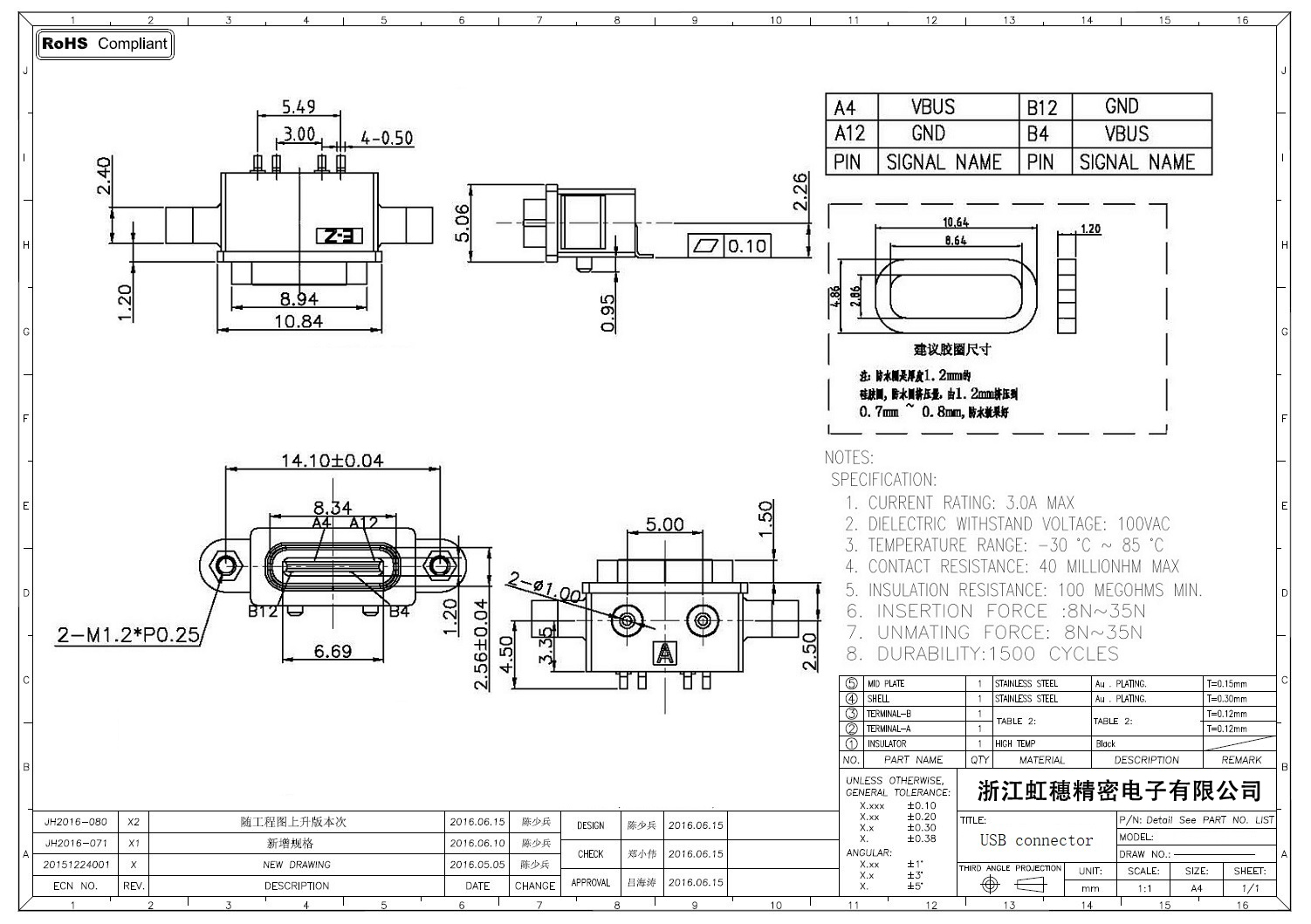 USB TypeC防水母座技術參數: