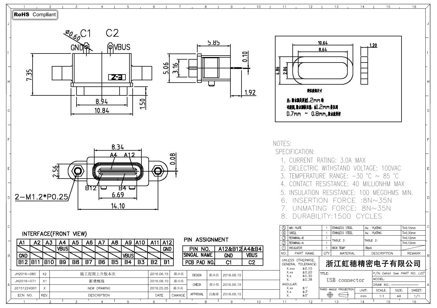 USB TypeC防水母座技術參數: