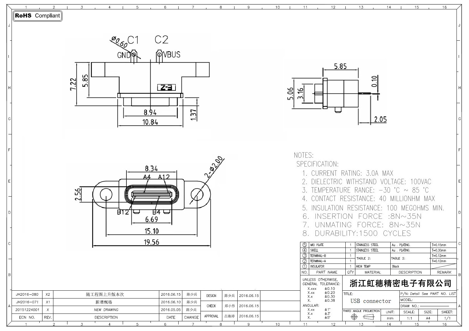 USB TypeC防水母座技術參數: