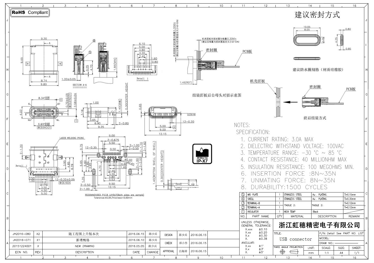 USB TypeC防水母座技術(shù)參數(shù):