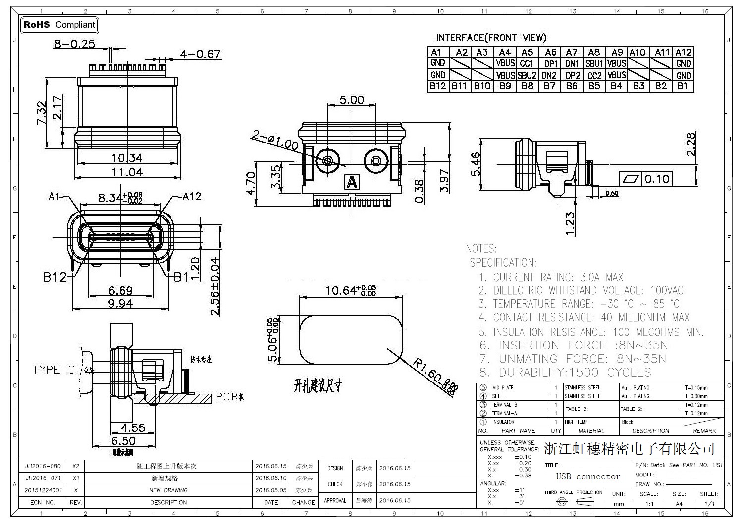 USB TypeC防水母座技術參數(shù):