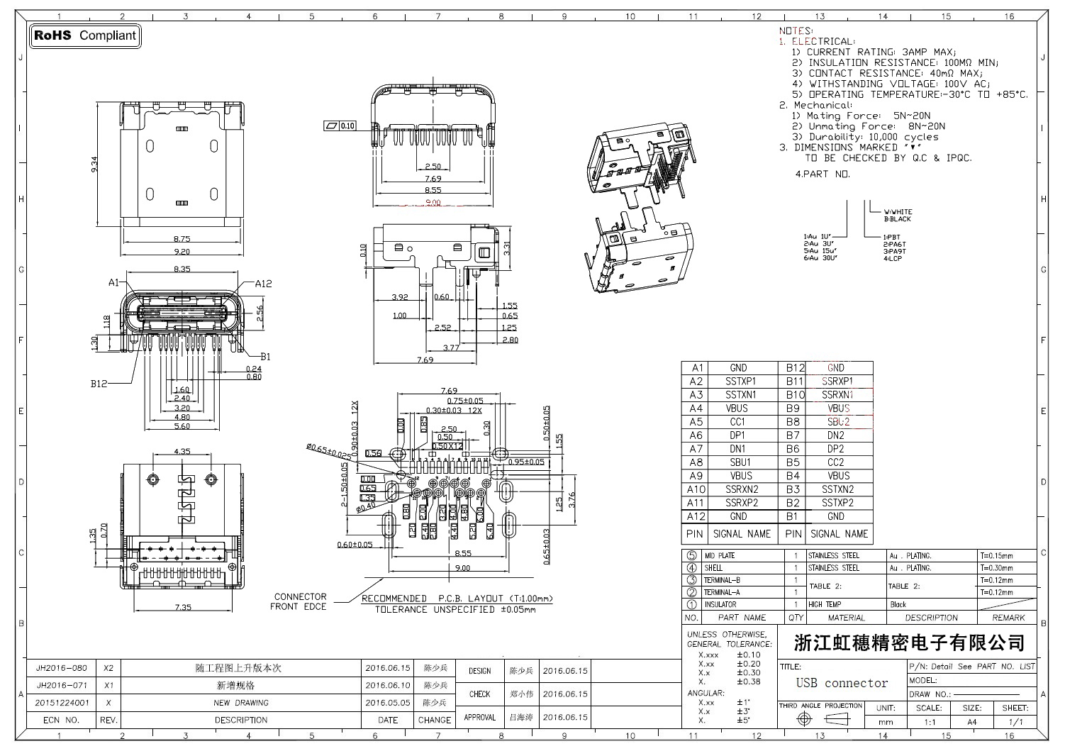 USB Type C母座技術(shù)參數(shù):