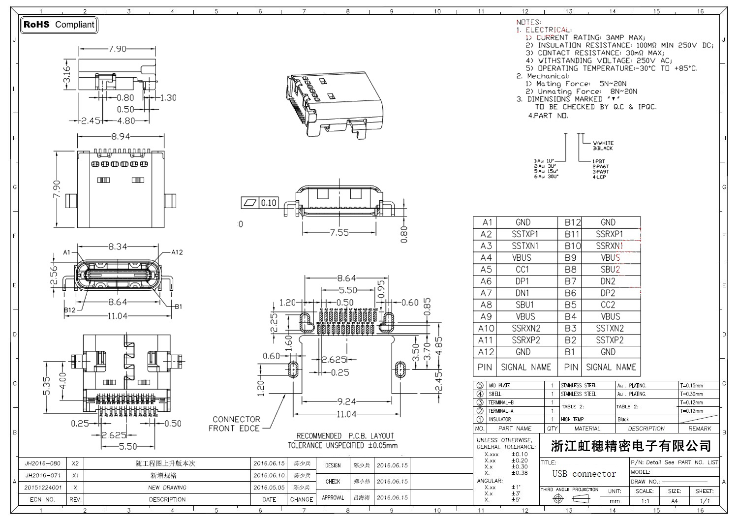 USB Type C母座技術參數: