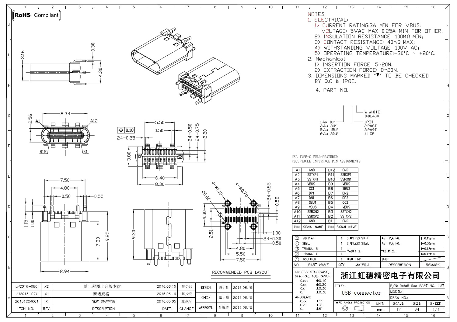 USB Type C母座技術(shù)參數(shù):