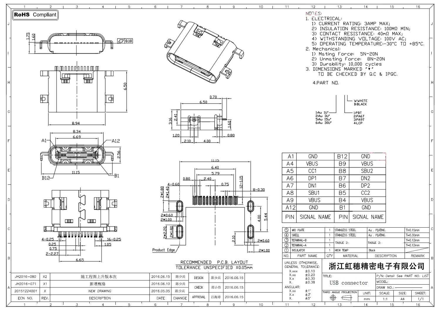 USB Type C母座技術參數: