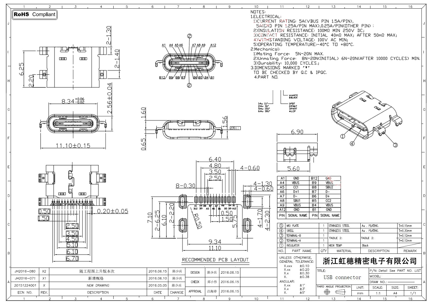 USB Type C母座技術(shù)參數(shù):
