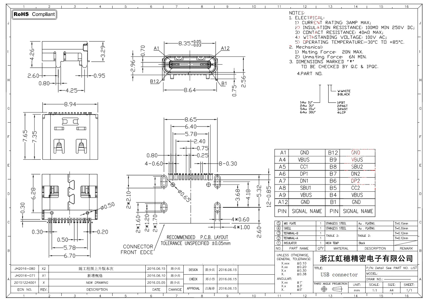 USB Type C母座技術(shù)參數(shù):