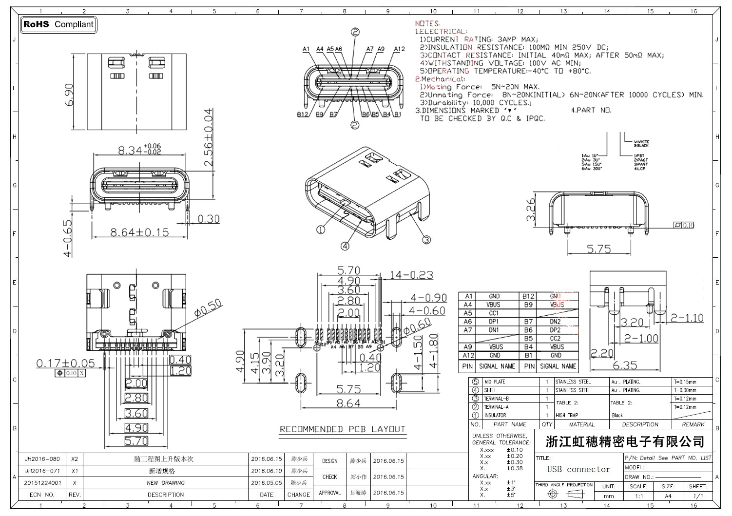 USB Type C母座技術參數(shù):