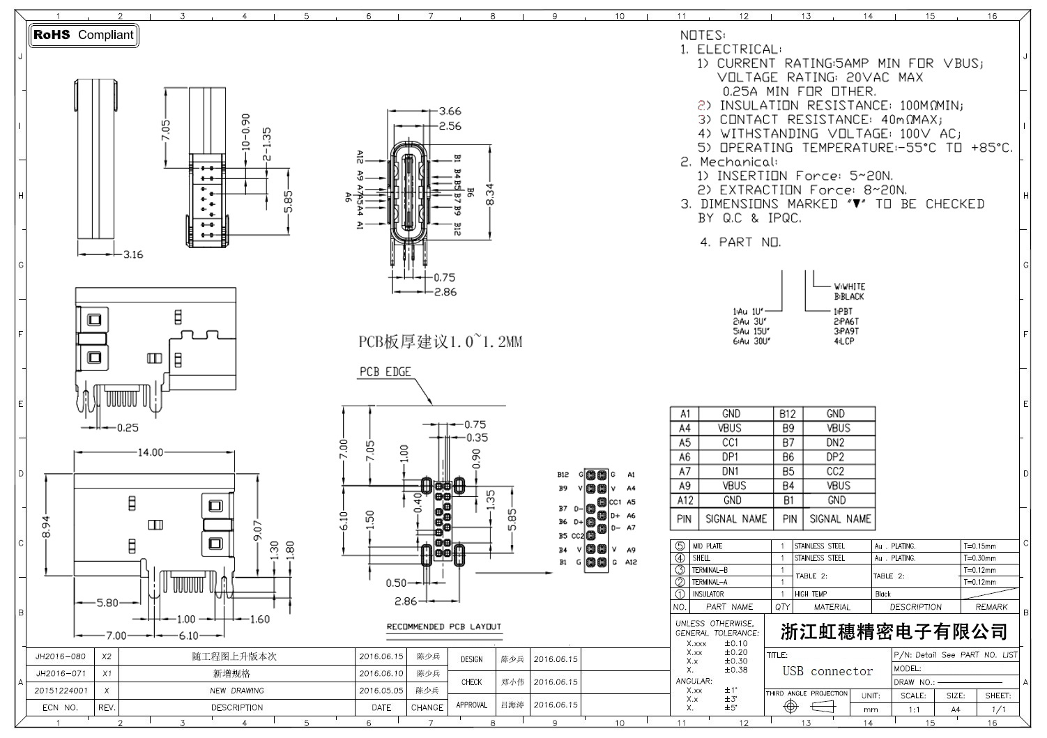 USB Type C母座技術參數: