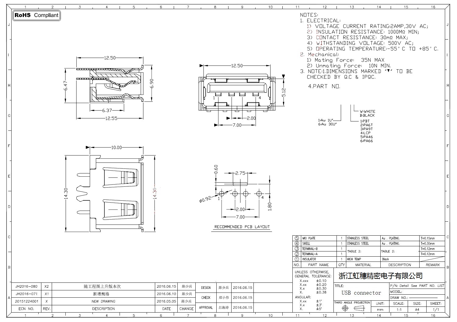 2.0USB插座技術參數: