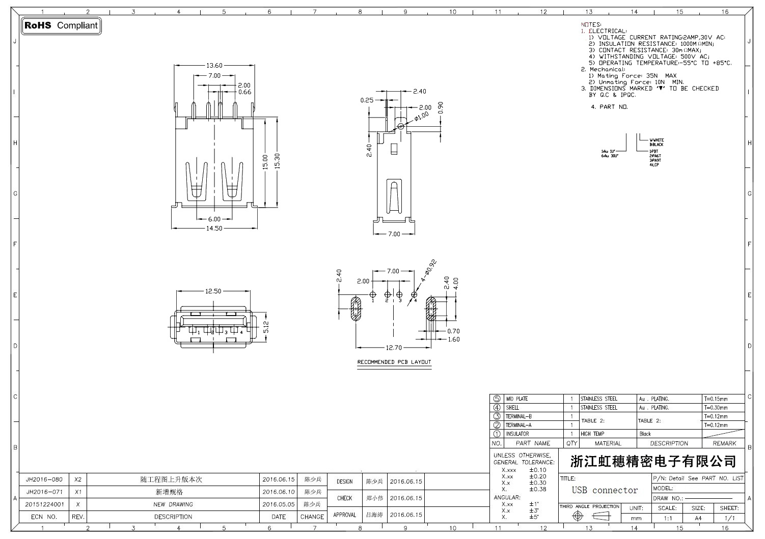2.0USB插座技術參數:
