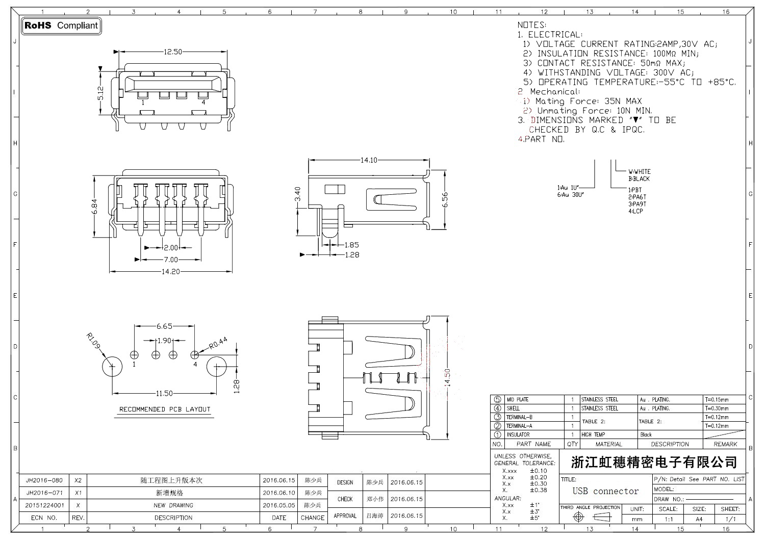 2.0USB插座技術參數: