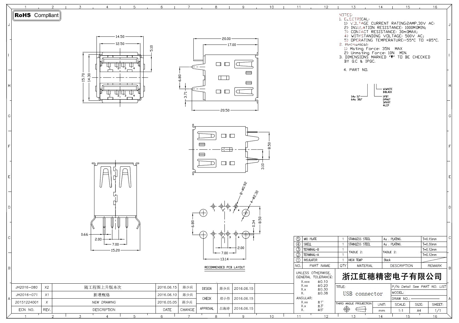 2.0USB插座技術參數: