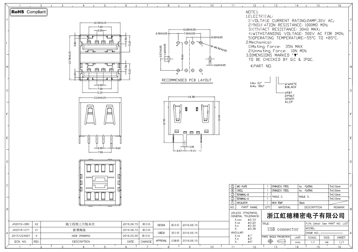 2.0USB插座技術參數: