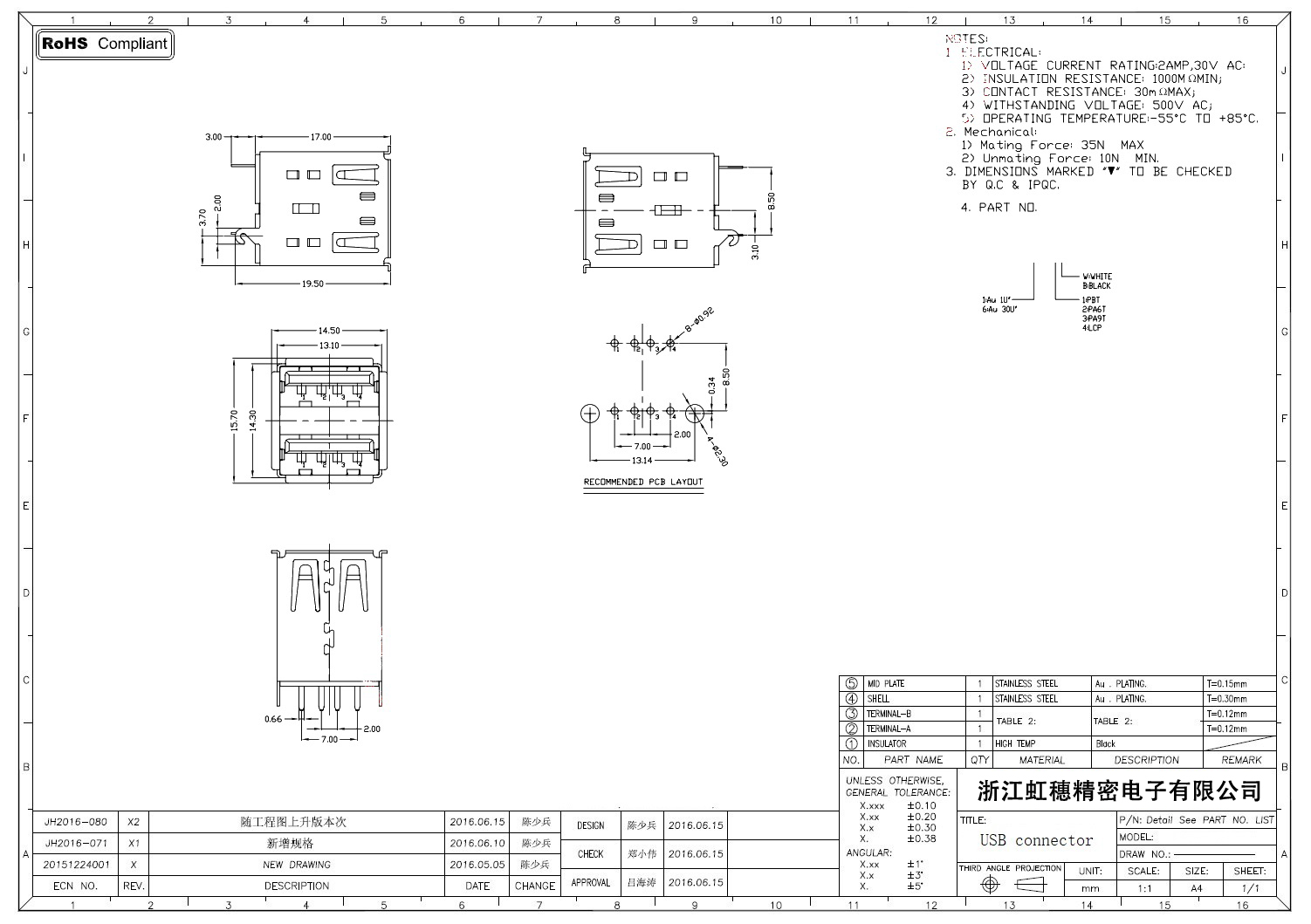 2.0USB插座技術參數: