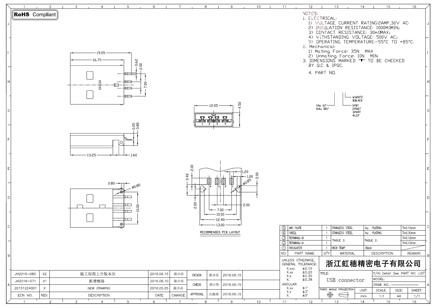 2.0USB插座技術參數: