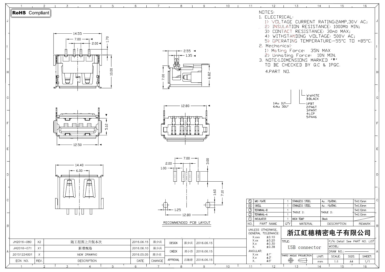 2.0USB插座技術參數: