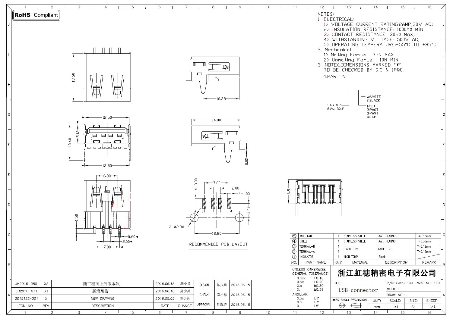 2.0USB插座技術參數: