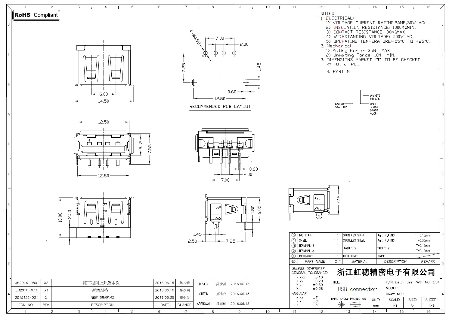 2.0USB插座技術參數:
