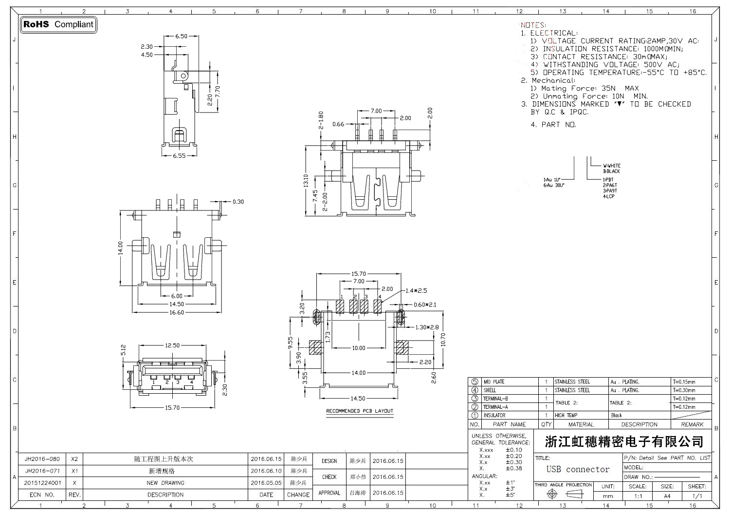 2.0USB插座技術參數: