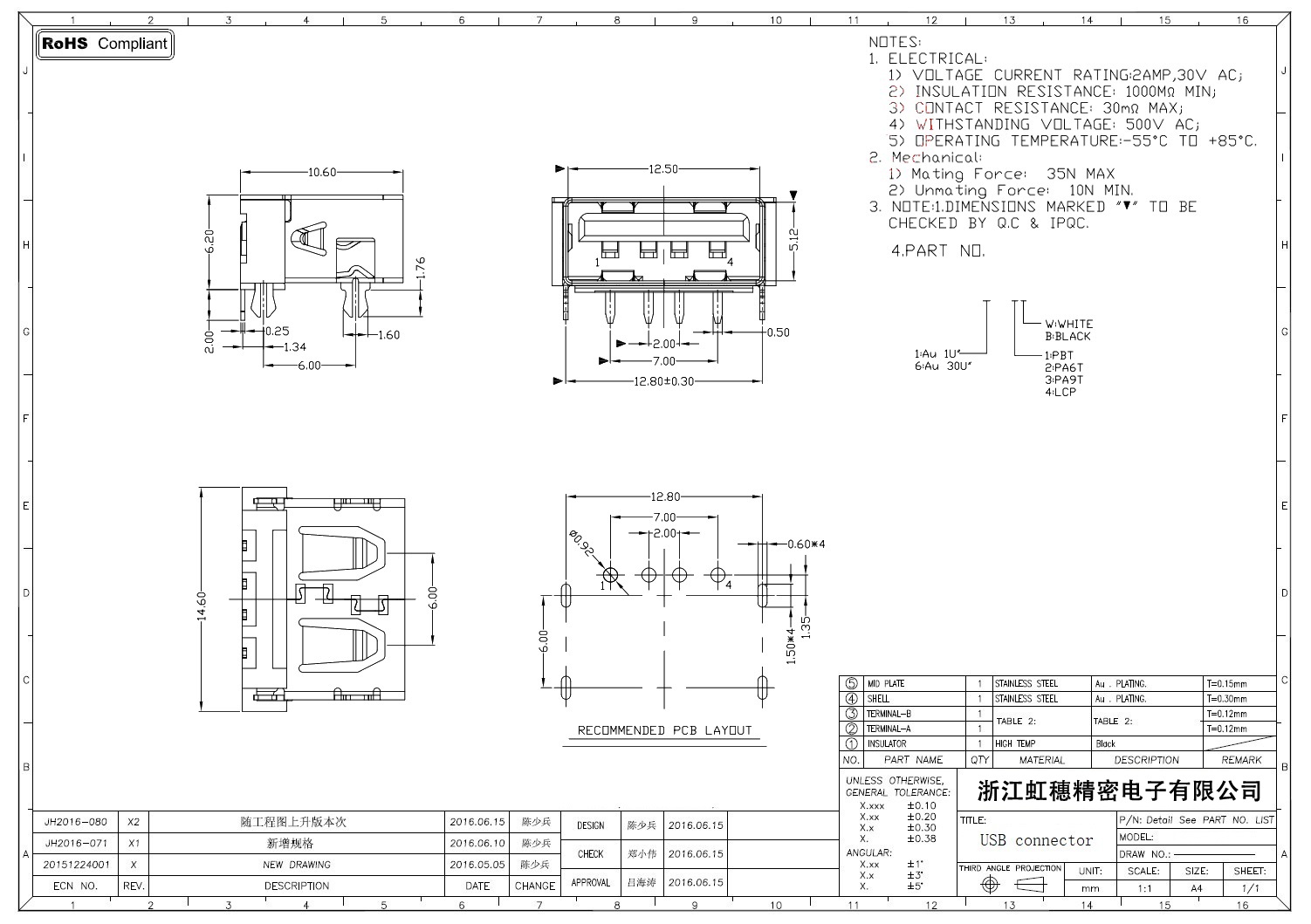 2.0USB插座技術參數: