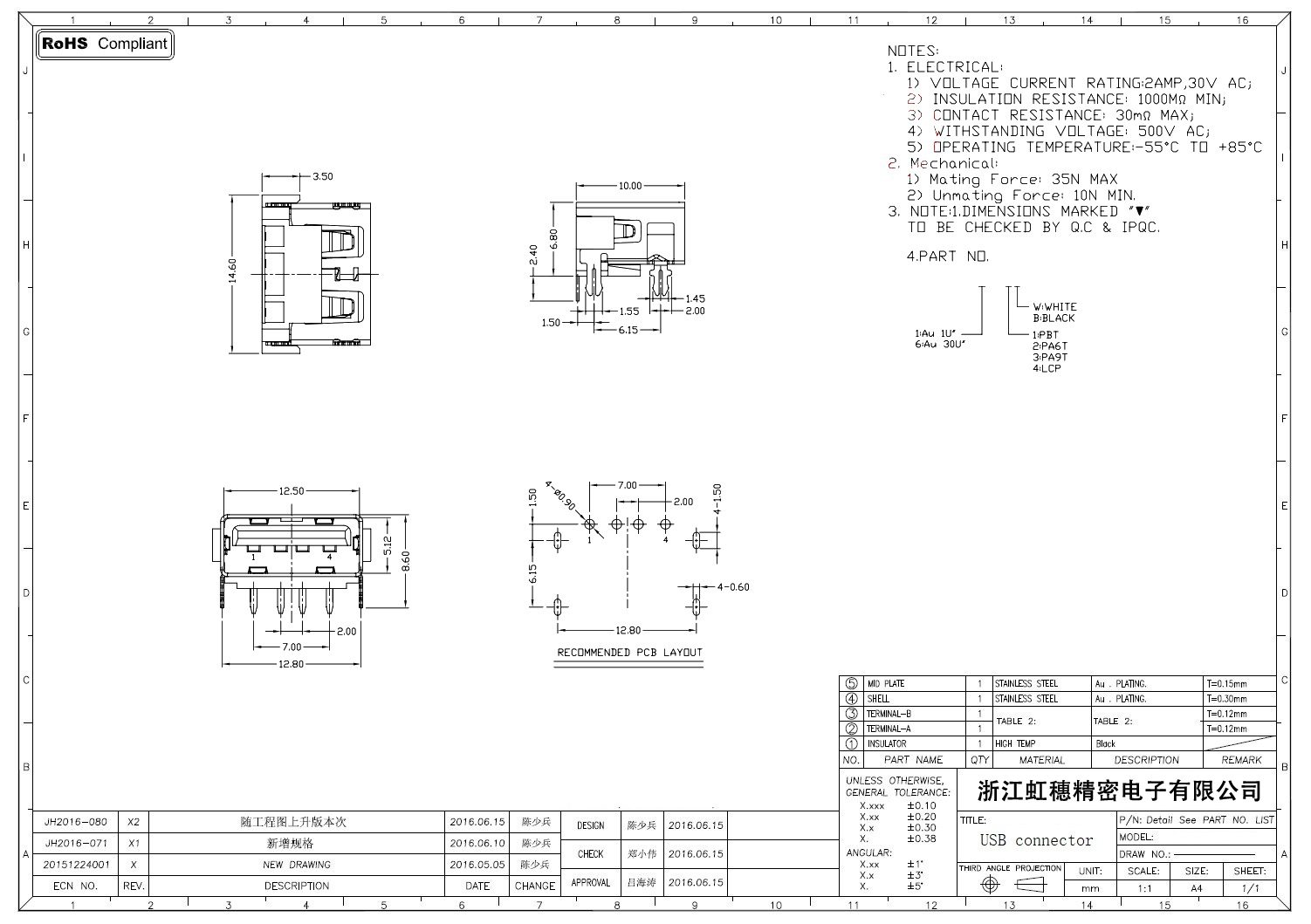 2.0USB插座技術參數: