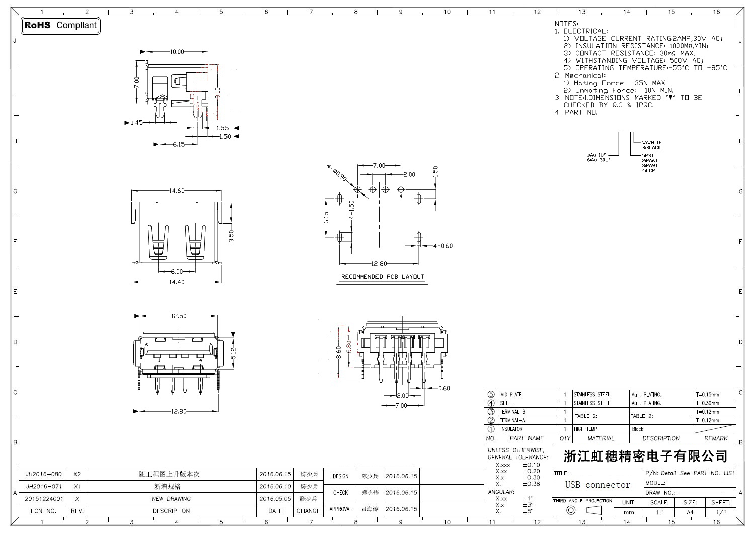 2.0USB插座技術參數: