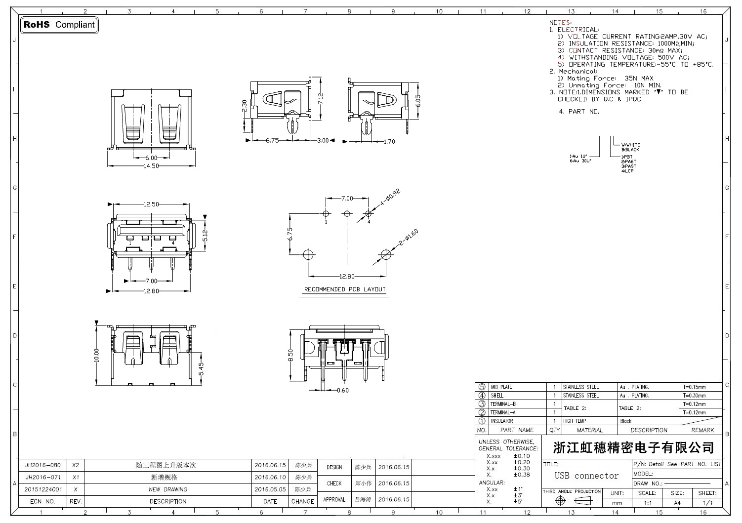 2.0USB插座技術參數: