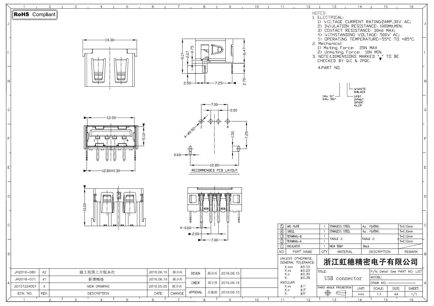 2.0USB插座技術參數: