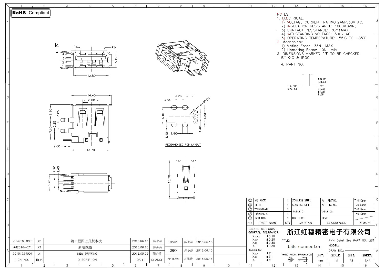2.0USB插座技術參數: