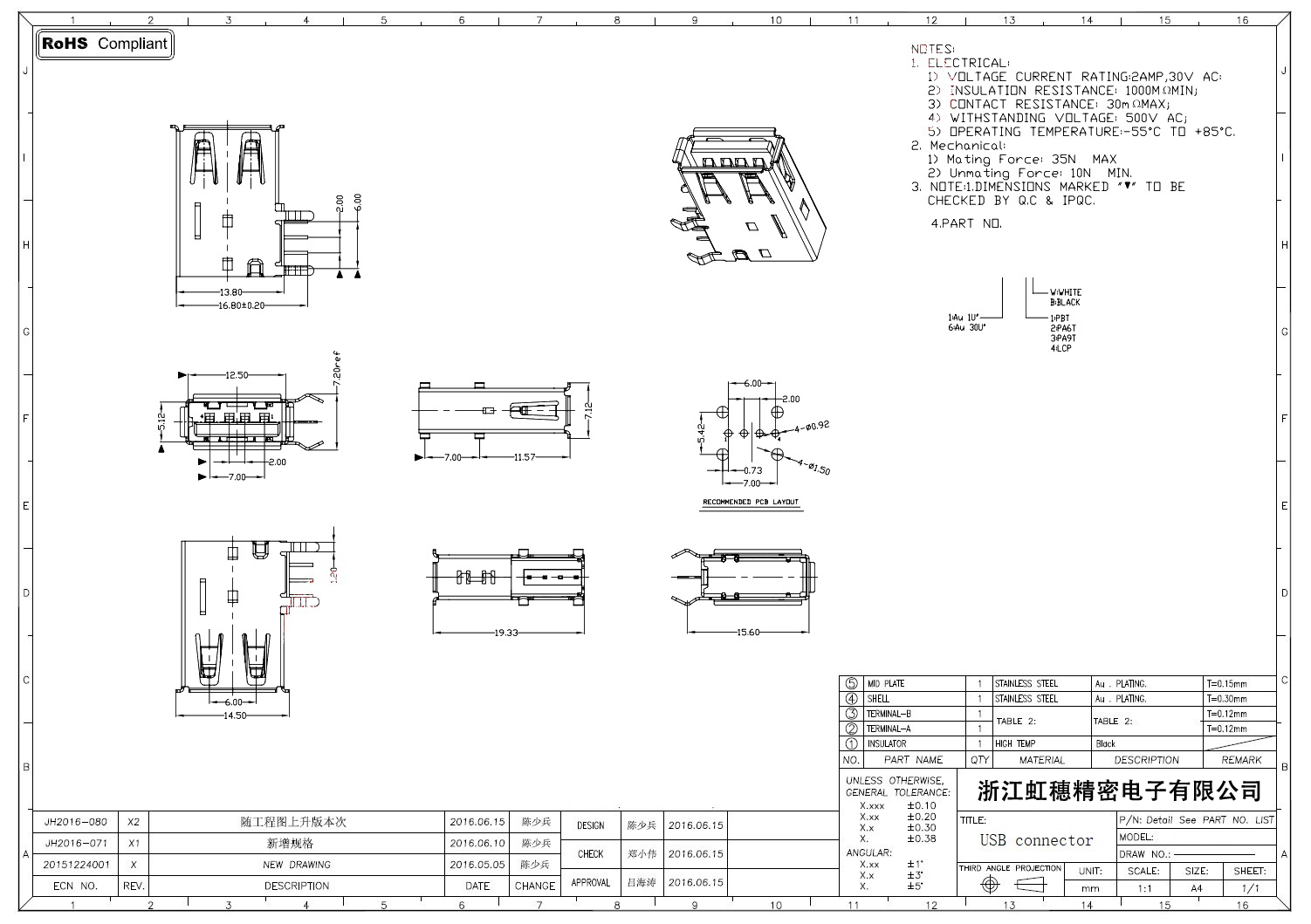 2.0USB插座技術(shù)參數(shù):